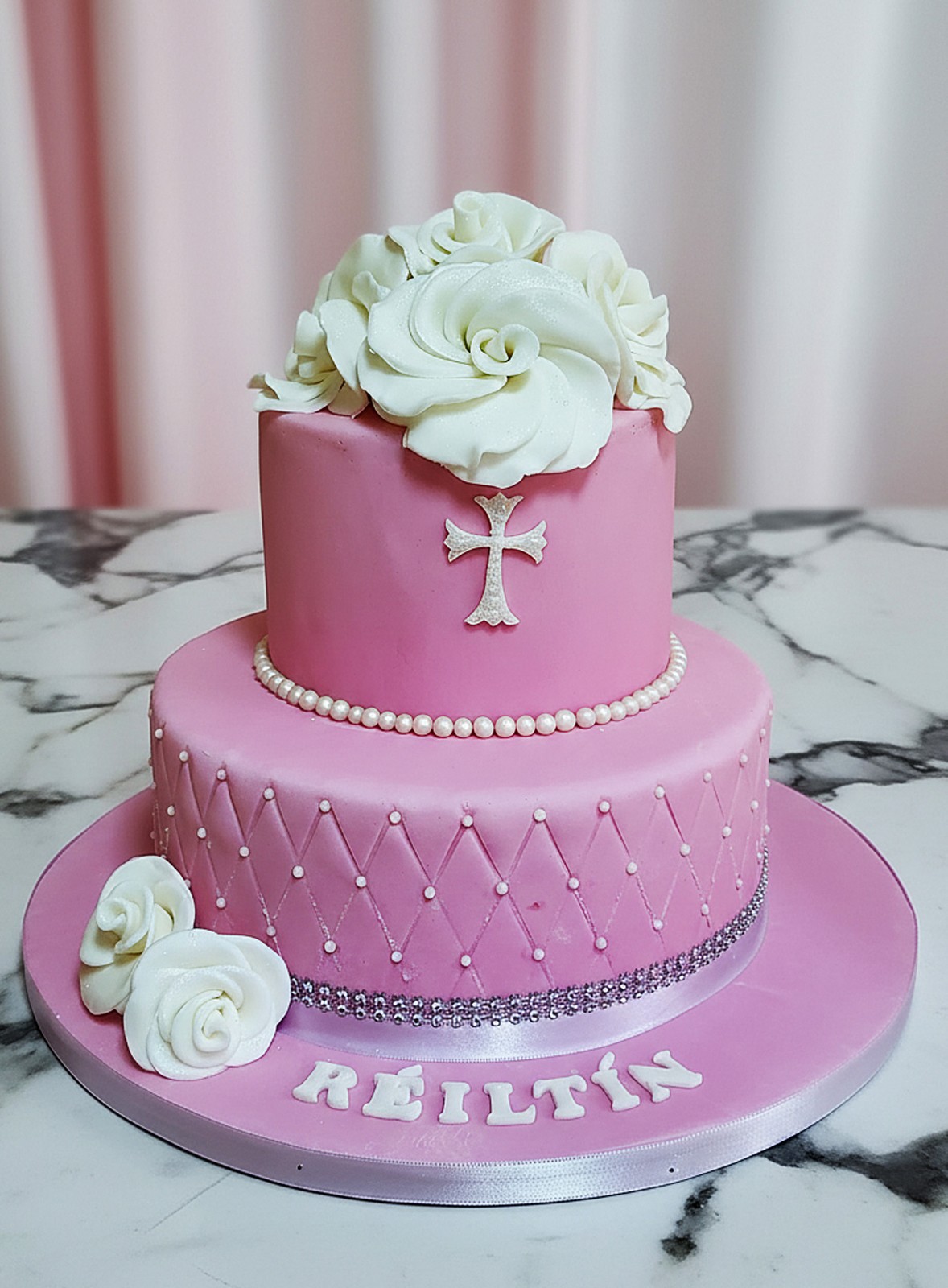 A white cross rests on the top tier, framed by delicate roses and a string of edible pearls. These elements honour the spiritual significance of the occasion — faith, blessing and the quiet beauty of devotion.